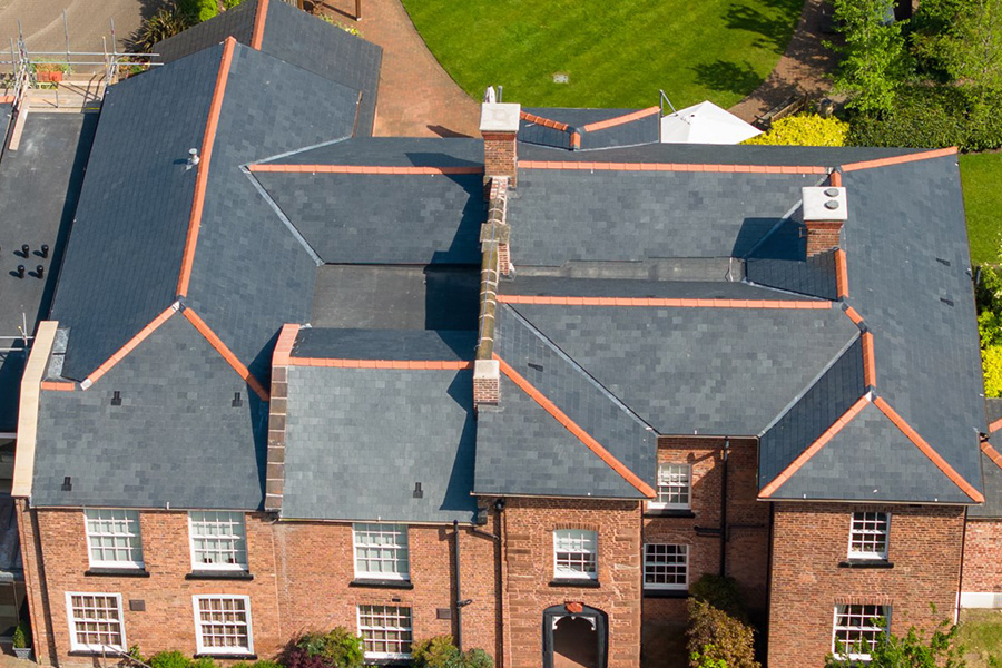 All of the existing slates to the pitched areas were stripped back to the rafters and replaced with ‘Cupa R5’ slates on new battens and Glidevale vp300 vapour permeable underlay. Red terracotta ridge and hip tiles were mechanically fixed through a ventilation layer to compliment the grey slate.