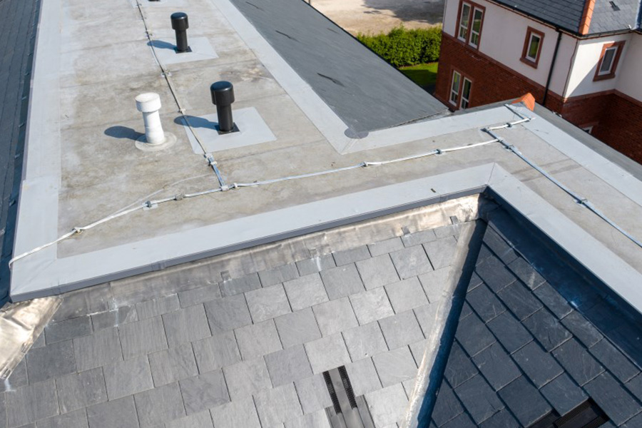 When the roof areas became due for refurbishment, partly due to some developing defects, BBR Roofing were appoint-ed to carry out the roofing replacement as well as a programme of associated improvement works to stonework, roof ventilation and roof void fire-stopping.